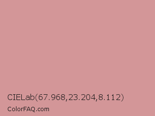 CIELab 67.968,23.204,8.112 Color is a light red color and the nearest color is Parrot Pink #d998a0. Hex code #d39698 and RGB value is rgb(211,150,152). In RGB color space, this color is composed of 83% red, 59% green, 60% blue, In CMYK color space, this color is composed of 0% cyan, 29% magenta, 28% yellow , 17% black , In HSL color space, this color has a hue angle of 358° , 41% saturation and 71% lightness.