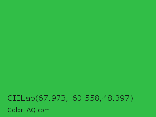 CIELab 67.973,-60.558,48.397 Color is a normal green color and the nearest color is Wageningen Green #34b233. Hex code #31be47 and RGB value is rgb(49,190,71). In RGB color space, this color is composed of 19% red, 75% green, 28% blue, In CMYK color space, this color is composed of 74% cyan, 0% magenta, 63% yellow , 25% black , In HSL color space, this color has a hue angle of 129° , 59% saturation and 47% lightness.