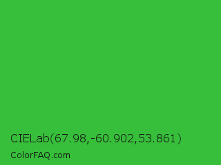 CIELab 67.98,-60.902,53.861 Color is a normal green color and the nearest color is Wageningen Green #34b233. Hex code #37be3a and RGB value is rgb(55,190,58). In RGB color space, this color is composed of 22% red, 75% green, 23% blue, In CMYK color space, this color is composed of 71% cyan, 0% magenta, 69% yellow , 25% black , In HSL color space, this color has a hue angle of 121° , 55% saturation and 48% lightness.