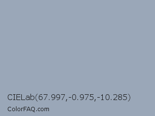 CIELab 67.997,-0.975,-10.285 Color is a light blue color and the nearest color is Gull Gray #9dacb7. Hex code #9aa7b8 and RGB value is rgb(154,167,184). In RGB color space, this color is composed of 60% red, 65% green, 72% blue, In CMYK color space, this color is composed of 16% cyan, 9% magenta, 0% yellow , 28% black , In HSL color space, this color has a hue angle of 214° , 17% saturation and 66% lightness.