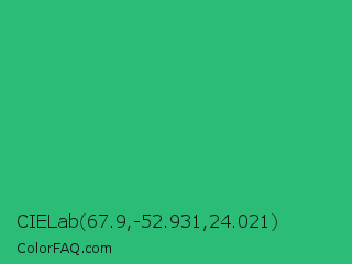 CIELab 67.9,-52.931,24.021 Color is a normal green color and the nearest color is Medium Sea Green #3cb371. Hex code #2bbc78 and RGB value is rgb(43,188,120). In RGB color space, this color is composed of 17% red, 74% green, 47% blue, In CMYK color space, this color is composed of 77% cyan, 0% magenta, 36% yellow , 26% black , In HSL color space, this color has a hue angle of 152° , 63% saturation and 45% lightness.