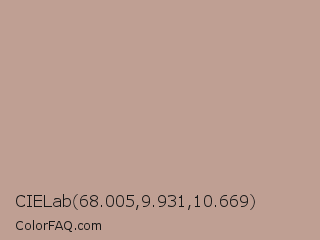 CIELab 68.005,9.931,10.669 Color is a light orange color and the nearest color is Tuscany #c09999. Hex code #bf9f93 and RGB value is rgb(191,159,147). In RGB color space, this color is composed of 75% red, 62% green, 58% blue, In CMYK color space, this color is composed of 0% cyan, 17% magenta, 23% yellow , 25% black , In HSL color space, this color has a hue angle of 16° , 26% saturation and 66% lightness.