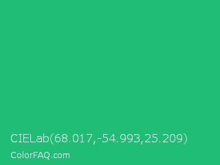 CIELab 68.017,-54.993,25.209 Color is a normal green color and the nearest color is Green Crayola #1cac78. Hex code #1fbd76 and RGB value is rgb(31,189,118). In RGB color space, this color is composed of 12% red, 74% green, 46% blue, In CMYK color space, this color is composed of 84% cyan, 0% magenta, 38% yellow , 26% black , In HSL color space, this color has a hue angle of 153° , 72% saturation and 43% lightness.