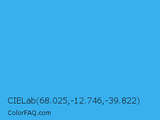 CIELab 68.025,-12.746,-39.822 Color is a normal blue color and the nearest color is Picton Blue #45b1e8. Hex code #38b0ed and RGB value is rgb(56,176,237). In RGB color space, this color is composed of 22% red, 69% green, 93% blue, In CMYK color space, this color is composed of 76% cyan, 26% magenta, 0% yellow , 7% black , In HSL color space, this color has a hue angle of 200° , 83% saturation and 57% lightness.