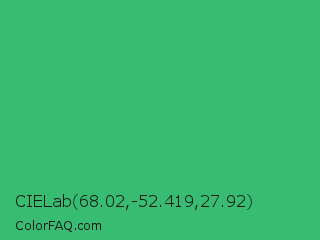 CIELab 68.02,-52.419,27.92 Color is a normal green color and the nearest color is Medium Sea Green #3cb371. Hex code #38bc71 and RGB value is rgb(56,188,113). In RGB color space, this color is composed of 22% red, 74% green, 44% blue, In CMYK color space, this color is composed of 70% cyan, 0% magenta, 40% yellow , 26% black , In HSL color space, this color has a hue angle of 146° , 54% saturation and 48% lightness.
