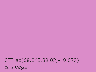 CIELab 68.045,39.02,-19.072 Color is a light magenta color and the nearest color is Shocking #e292c0. Hex code #db8cc9 and RGB value is rgb(219,140,201). In RGB color space, this color is composed of 86% red, 55% green, 79% blue, In CMYK color space, this color is composed of 0% cyan, 36% magenta, 8% yellow , 14% black , In HSL color space, this color has a hue angle of 314° , 52% saturation and 70% lightness.