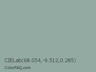 CIELab 68.054,-9.512,0.285 Color is a light cyan color and the nearest color is Pewter #96a8a1. Hex code #93aba5 and RGB value is rgb(147,171,165). In RGB color space, this color is composed of 58% red, 67% green, 65% blue, In CMYK color space, this color is composed of 14% cyan, 0% magenta, 4% yellow , 33% black , In HSL color space, this color has a hue angle of 165° , 13% saturation and 62% lightness.