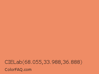 CIELab 68.055,33.988,36.888 Color is a light orange color and the nearest color is Big Foot Feet #e88e5a. Hex code #ef8c65 and RGB value is rgb(239,140,101). In RGB color space, this color is composed of 94% red, 55% green, 40% blue, In CMYK color space, this color is composed of 0% cyan, 41% magenta, 58% yellow , 6% black , In HSL color space, this color has a hue angle of 17° , 81% saturation and 67% lightness.