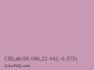 CIELab 68.086,22.442,-6.375 Color is a light rose color and the nearest color is Viola #cb8fa9. Hex code #c998b2 and RGB value is rgb(201,152,178). In RGB color space, this color is composed of 79% red, 60% green, 70% blue, In CMYK color space, this color is composed of 0% cyan, 24% magenta, 11% yellow , 21% black , In HSL color space, this color has a hue angle of 328° , 31% saturation and 69% lightness.