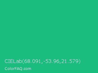 CIELab 68.091,-53.96,21.579 Color is a normal green color and the nearest color is Mountain Meadow Crayola #1ab385. Hex code #1abd7d and RGB value is rgb(26,189,125). In RGB color space, this color is composed of 10% red, 74% green, 49% blue, In CMYK color space, this color is composed of 86% cyan, 0% magenta, 34% yellow , 26% black , In HSL color space, this color has a hue angle of 156° , 76% saturation and 42% lightness.