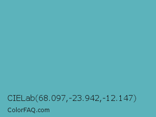 CIELab 68.097,-23.942,-12.147 Color is a normal cyan color and the nearest color is Fountain Blue #56b4be. Hex code #5cb3bb and RGB value is rgb(92,179,187). In RGB color space, this color is composed of 36% red, 70% green, 73% blue, In CMYK color space, this color is composed of 51% cyan, 4% magenta, 0% yellow , 27% black , In HSL color space, this color has a hue angle of 185° , 41% saturation and 55% lightness.