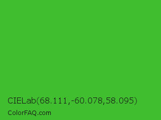 CIELab 68.111,-60.078,58.095 Color is a normal green color and the nearest color is Wageningen Green #34b233. Hex code #40be2f and RGB value is rgb(64,190,47). In RGB color space, this color is composed of 25% red, 75% green, 18% blue, In CMYK color space, this color is composed of 66% cyan, 0% magenta, 75% yellow , 25% black , In HSL color space, this color has a hue angle of 113° , 60% saturation and 46% lightness.