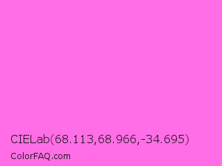 CIELab 68.113,68.966,-34.695 Color is a light magenta color and the nearest color is Pale Magenta #f984e5. Hex code #ff6ee6 and RGB value is rgb(255,110,230). In RGB color space, this color is composed of 100% red, 43% green, 90% blue, In CMYK color space, this color is composed of 0% cyan, 57% magenta, 10% yellow , 0% black , In HSL color space, this color has a hue angle of 310° , 100% saturation and 72% lightness.