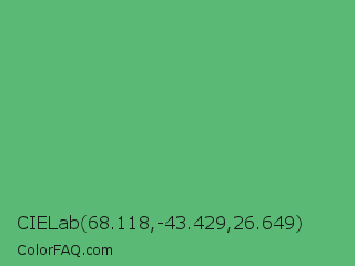 CIELab 68.118,-43.429,26.649 Color is a normal green color and the nearest color is Fern #63b76c. Hex code #5ab974 and RGB value is rgb(90,185,116). In RGB color space, this color is composed of 35% red, 73% green, 45% blue, In CMYK color space, this color is composed of 51% cyan, 0% magenta, 37% yellow , 27% black , In HSL color space, this color has a hue angle of 136° , 40% saturation and 54% lightness.