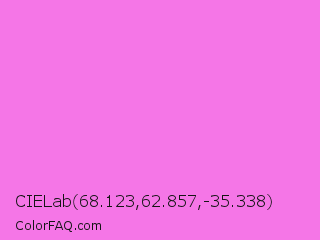 CIELab 68.123,62.857,-35.338 Color is a light magenta color and the nearest color is Pale Magenta #f984e5. Hex code #f576e7 and RGB value is rgb(245,118,231). In RGB color space, this color is composed of 96% red, 46% green, 91% blue, In CMYK color space, this color is composed of 0% cyan, 52% magenta, 6% yellow , 4% black , In HSL color space, this color has a hue angle of 307° , 86% saturation and 71% lightness.