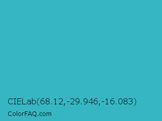 CIELab 68.12,-29.946,-16.083 Color is a normal cyan color and the nearest color is Maximum Blue Green #30bfbf. Hex code #36b6c2 and RGB value is rgb(54,182,194). In RGB color space, this color is composed of 21% red, 71% green, 76% blue, In CMYK color space, this color is composed of 72% cyan, 6% magenta, 0% yellow , 24% black , In HSL color space, this color has a hue angle of 185° , 56% saturation and 49% lightness.