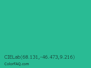 CIELab 68.131,-46.473,9.216 Color is a normal cyan color and the nearest color is Mountain Meadow #30ba8f. Hex code #29bb94 and RGB value is rgb(41,187,148). In RGB color space, this color is composed of 16% red, 73% green, 58% blue, In CMYK color space, this color is composed of 78% cyan, 0% magenta, 21% yellow , 27% black , In HSL color space, this color has a hue angle of 164° , 64% saturation and 45% lightness.