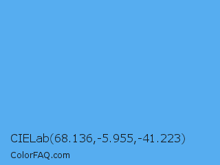 CIELab 68.136,-5.955,-41.223 Color is a light blue color and the nearest color is Blue Jeans #5dadec. Hex code #56adf0 and RGB value is rgb(86,173,240). In RGB color space, this color is composed of 34% red, 68% green, 94% blue, In CMYK color space, this color is composed of 64% cyan, 28% magenta, 0% yellow , 6% black , In HSL color space, this color has a hue angle of 206° , 84% saturation and 64% lightness.