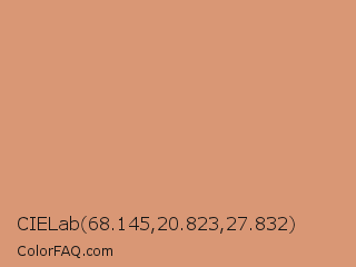 CIELab 68.145,20.823,27.832 Color is a light orange color and the nearest color is Burning Sand #d99376. Hex code #d99775 and RGB value is rgb(217,151,117). In RGB color space, this color is composed of 85% red, 59% green, 46% blue, In CMYK color space, this color is composed of 0% cyan, 30% magenta, 46% yellow , 15% black , In HSL color space, this color has a hue angle of 20° , 57% saturation and 65% lightness.