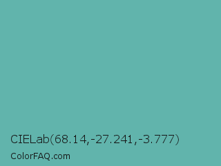 CIELab 68.14,-27.241,-3.777 Color is a normal cyan color and the nearest color is Tradewind #5fb3ac. Hex code #61b4ac and RGB value is rgb(97,180,172). In RGB color space, this color is composed of 38% red, 71% green, 67% blue, In CMYK color space, this color is composed of 46% cyan, 0% magenta, 4% yellow , 29% black , In HSL color space, this color has a hue angle of 174° , 36% saturation and 54% lightness.