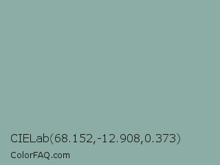 CIELab 68.152,-12.908,0.373 Color is a light cyan color and the nearest color is Cascade #8ba9a5. Hex code #8cada5 and RGB value is rgb(140,173,165). In RGB color space, this color is composed of 55% red, 68% green, 65% blue, In CMYK color space, this color is composed of 19% cyan, 0% magenta, 5% yellow , 32% black , In HSL color space, this color has a hue angle of 165° , 17% saturation and 61% lightness.