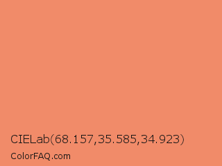 CIELab 68.157,35.585,34.923 Color is a light color and the nearest color is Salmon #ff8c69. Hex code #f18b69 and RGB value is rgb(241,139,105). In RGB color space, this color is composed of 95% red, 55% green, 41% blue, In CMYK color space, this color is composed of 0% cyan, 42% magenta, 56% yellow , 5% black , In HSL color space, this color has a hue angle of 15° , 83% saturation and 68% lightness.
