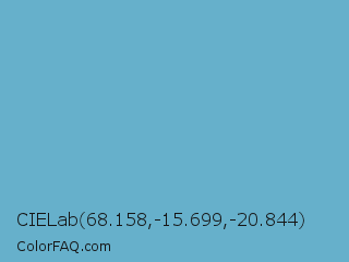 CIELab 68.158,-15.699,-20.844 Color is a normal blue color and the nearest color is Iceberg #71a6d2. Hex code #66b0cb and RGB value is rgb(102,176,203). In RGB color space, this color is composed of 40% red, 69% green, 80% blue, In CMYK color space, this color is composed of 50% cyan, 13% magenta, 0% yellow , 20% black , In HSL color space, this color has a hue angle of 196° , 49% saturation and 60% lightness.
