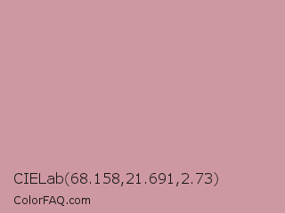 CIELab 68.158,21.691,2.73 Color is a light red color and the nearest color is Can Can #d591a4. Hex code #ce98a2 and RGB value is rgb(206,152,162). In RGB color space, this color is composed of 81% red, 60% green, 64% blue, In CMYK color space, this color is composed of 0% cyan, 26% magenta, 21% yellow , 19% black , In HSL color space, this color has a hue angle of 349° , 36% saturation and 70% lightness.