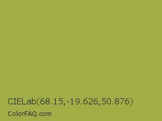 CIELab 68.15,-19.626,50.876 Color is a normal yellow color and the nearest color is Brass #b5a642. Hex code #a0ae45 and RGB value is rgb(160,174,69). In RGB color space, this color is composed of 63% red, 68% green, 27% blue, In CMYK color space, this color is composed of 8% cyan, 0% magenta, 60% yellow , 32% black , In HSL color space, this color has a hue angle of 68° , 43% saturation and 48% lightness.
