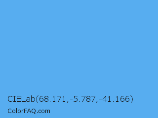 CIELab 68.171,-5.787,-41.166 Color is a light blue color and the nearest color is Blue Jeans #5dadec. Hex code #57adf0 and RGB value is rgb(87,173,240). In RGB color space, this color is composed of 34% red, 68% green, 94% blue, In CMYK color space, this color is composed of 64% cyan, 28% magenta, 0% yellow , 6% black , In HSL color space, this color has a hue angle of 206° , 84% saturation and 64% lightness.
