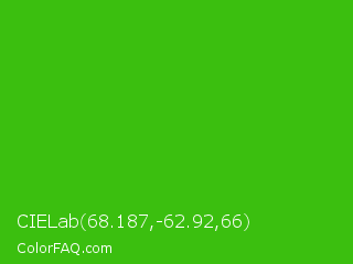 CIELab 68.187,-62.92,66 Color is a normal green color and the nearest color is Harlequin Green #46cb18. Hex code #3bbf0f and RGB value is rgb(59,191,15). In RGB color space, this color is composed of 23% red, 75% green, 6% blue, In CMYK color space, this color is composed of 69% cyan, 0% magenta, 92% yellow , 25% black , In HSL color space, this color has a hue angle of 105° , 85% saturation and 40% lightness.