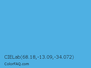 CIELab 68.18,-13.09,-34.072 Color is a normal blue color and the nearest color is Picton Blue #45b1e8. Hex code #4eb0e3 and RGB value is rgb(78,176,227). In RGB color space, this color is composed of 31% red, 69% green, 89% blue, In CMYK color space, this color is composed of 66% cyan, 22% magenta, 0% yellow , 11% black , In HSL color space, this color has a hue angle of 201° , 73% saturation and 60% lightness.