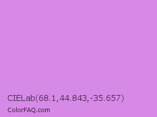 CIELab 68.1,44.843,-35.657 Color is a light purple color and the nearest color is Bright Lilac #d891ef. Hex code #d789e7 and RGB value is rgb(215,137,231). In RGB color space, this color is composed of 84% red, 54% green, 91% blue, In CMYK color space, this color is composed of 7% cyan, 41% magenta, 0% yellow , 9% black , In HSL color space, this color has a hue angle of 290° , 66% saturation and 72% lightness.