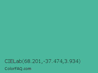 CIELab 68.201,-37.474,3.934 Color is a normal cyan color and the nearest color is Ocean Green #48bf91. Hex code #4bb89e and RGB value is rgb(75,184,158). In RGB color space, this color is composed of 29% red, 72% green, 62% blue, In CMYK color space, this color is composed of 59% cyan, 0% magenta, 14% yellow , 28% black , In HSL color space, this color has a hue angle of 166° , 43% saturation and 51% lightness.