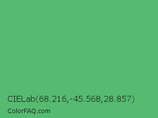 CIELab 68.216,-45.568,28.857 Color is a normal green color and the nearest color is Fern #63b76c. Hex code #56ba70 and RGB value is rgb(86,186,112). In RGB color space, this color is composed of 34% red, 73% green, 44% blue, In CMYK color space, this color is composed of 54% cyan, 0% magenta, 40% yellow , 27% black , In HSL color space, this color has a hue angle of 136° , 42% saturation and 53% lightness.