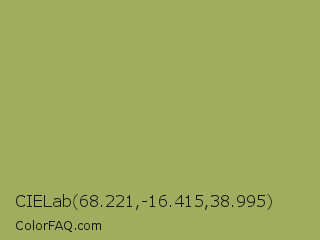 CIELab 68.221,-16.415,38.995 Color is a normal yellow color and the nearest color is Green Smoke #a4af6e. Hex code #a1ad5e and RGB value is rgb(161,173,94). In RGB color space, this color is composed of 63% red, 68% green, 37% blue, In CMYK color space, this color is composed of 7% cyan, 0% magenta, 46% yellow , 32% black , In HSL color space, this color has a hue angle of 69° , 33% saturation and 52% lightness.