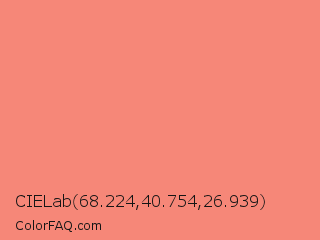 CIELab 68.224,40.754,26.939 Color is a light red color and the nearest color is Tea Rose #f88379. Hex code #f68778 and RGB value is rgb(246,135,120). In RGB color space, this color is composed of 96% red, 53% green, 47% blue, In CMYK color space, this color is composed of 0% cyan, 45% magenta, 51% yellow , 4% black , In HSL color space, this color has a hue angle of 7° , 88% saturation and 72% lightness.
