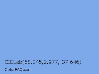 CIELab 68.245,2.977,-37.646 Color is a light blue color and the nearest color is Light Cobalt Blue #88ace0. Hex code #7da8ea and RGB value is rgb(125,168,234). In RGB color space, this color is composed of 49% red, 66% green, 92% blue, In CMYK color space, this color is composed of 47% cyan, 28% magenta, 0% yellow , 8% black , In HSL color space, this color has a hue angle of 216° , 72% saturation and 70% lightness.