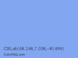 CIELab 68.248,7.038,-40.899 Color is a light blue color and the nearest color is Portage #8b9fee. Hex code #82a6f0 and RGB value is rgb(130,166,240). In RGB color space, this color is composed of 51% red, 65% green, 94% blue, In CMYK color space, this color is composed of 46% cyan, 31% magenta, 0% yellow , 6% black , In HSL color space, this color has a hue angle of 220° , 79% saturation and 73% lightness.