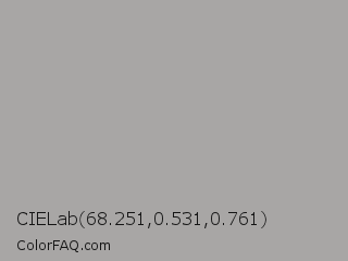CIELab 68.251,0.531,0.761 Color is a light orange color and the nearest color is Quick Silver #a6a6a6. Hex code #a8a6a5 and RGB value is rgb(168,166,165). In RGB color space, this color is composed of 66% red, 65% green, 65% blue, In CMYK color space, this color is composed of 0% cyan, 1% magenta, 2% yellow , 34% black , In HSL color space, this color has a hue angle of 20° , 2% saturation and 65% lightness.
