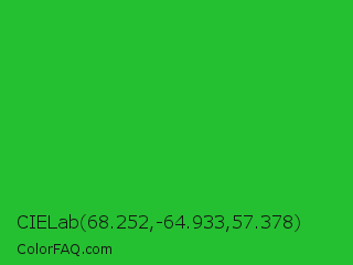 CIELab 68.252,-64.933,57.378 Color is a normal green color and the nearest color is Lime Green #32cd32. Hex code #25c031 and RGB value is rgb(37,192,49). In RGB color space, this color is composed of 15% red, 75% green, 19% blue, In CMYK color space, this color is composed of 81% cyan, 0% magenta, 74% yellow , 25% black , In HSL color space, this color has a hue angle of 125° , 68% saturation and 45% lightness.