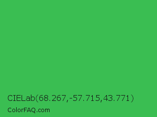 CIELab 68.267,-57.715,43.771 Color is a normal green color and the nearest color is Chateau Green #40a860. Hex code #3abe52 and RGB value is rgb(58,190,82). In RGB color space, this color is composed of 23% red, 75% green, 32% blue, In CMYK color space, this color is composed of 69% cyan, 0% magenta, 57% yellow , 25% black , In HSL color space, this color has a hue angle of 131° , 53% saturation and 49% lightness.