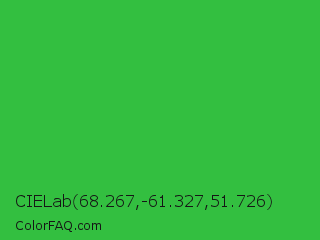 CIELab 68.267,-61.327,51.726 Color is a normal green color and the nearest color is Wageningen Green #34b233. Hex code #33bf40 and RGB value is rgb(51,191,64). In RGB color space, this color is composed of 20% red, 75% green, 25% blue, In CMYK color space, this color is composed of 73% cyan, 0% magenta, 66% yellow , 25% black , In HSL color space, this color has a hue angle of 126° , 58% saturation and 47% lightness.