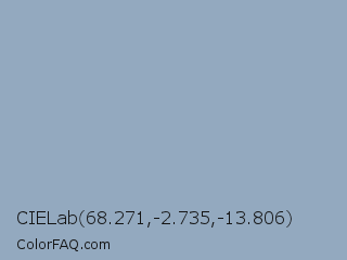 CIELab 68.271,-2.735,-13.806 Color is a light blue color and the nearest color is Nepal #8eabc1. Hex code #93a9bf and RGB value is rgb(147,169,191). In RGB color space, this color is composed of 58% red, 66% green, 75% blue, In CMYK color space, this color is composed of 23% cyan, 12% magenta, 0% yellow , 25% black , In HSL color space, this color has a hue angle of 210° , 26% saturation and 66% lightness.