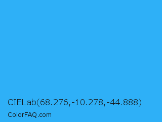 CIELab 68.276,-10.278,-44.888 Color is a normal blue color and the nearest color is Button Blue #24a0ed. Hex code #2eb0f7 and RGB value is rgb(46,176,247). In RGB color space, this color is composed of 18% red, 69% green, 97% blue, In CMYK color space, this color is composed of 81% cyan, 29% magenta, 0% yellow , 3% black , In HSL color space, this color has a hue angle of 201° , 93% saturation and 57% lightness.