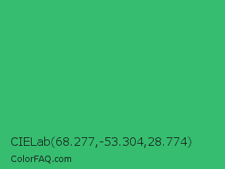 CIELab 68.277,-53.304,28.774 Color is a normal green color and the nearest color is Medium Sea Green #3cb371. Hex code #36bd70 and RGB value is rgb(54,189,112). In RGB color space, this color is composed of 21% red, 74% green, 44% blue, In CMYK color space, this color is composed of 71% cyan, 0% magenta, 41% yellow , 26% black , In HSL color space, this color has a hue angle of 146° , 56% saturation and 48% lightness.