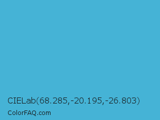 CIELab 68.285,-20.195,-26.803 Color is a normal blue color and the nearest color is Maximum Blue #47abcc. Hex code #45b3d6 and RGB value is rgb(69,179,214). In RGB color space, this color is composed of 27% red, 70% green, 84% blue, In CMYK color space, this color is composed of 68% cyan, 16% magenta, 0% yellow , 16% black , In HSL color space, this color has a hue angle of 194° , 64% saturation and 55% lightness.