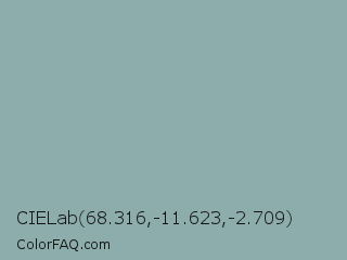 CIELab 68.316,-11.623,-2.709 Color is a light cyan color and the nearest color is Cascade #8ba9a5. Hex code #8cadab and RGB value is rgb(140,173,171). In RGB color space, this color is composed of 55% red, 68% green, 67% blue, In CMYK color space, this color is composed of 19% cyan, 0% magenta, 1% yellow , 32% black , In HSL color space, this color has a hue angle of 176° , 17% saturation and 61% lightness.