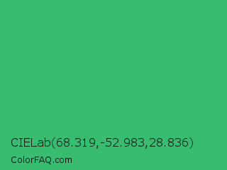CIELab 68.319,-52.983,28.836 Color is a normal green color and the nearest color is Medium Sea Green #3cb371. Hex code #38bd70 and RGB value is rgb(56,189,112). In RGB color space, this color is composed of 22% red, 74% green, 44% blue, In CMYK color space, this color is composed of 70% cyan, 0% magenta, 41% yellow , 26% black , In HSL color space, this color has a hue angle of 145° , 54% saturation and 48% lightness.