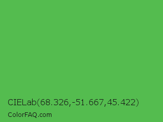 CIELab 68.326,-51.667,45.422 Color is a normal green color and the nearest color is Apple #4fa83d. Hex code #54bc4f and RGB value is rgb(84,188,79). In RGB color space, this color is composed of 33% red, 74% green, 31% blue, In CMYK color space, this color is composed of 55% cyan, 0% magenta, 58% yellow , 26% black , In HSL color space, this color has a hue angle of 117° , 45% saturation and 52% lightness.